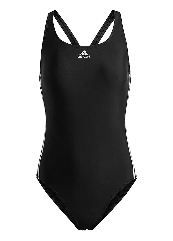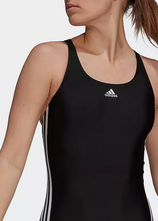 A crew neck swimsuit with small brand logo, 3-stripe design on the sides, and a stylish low back.