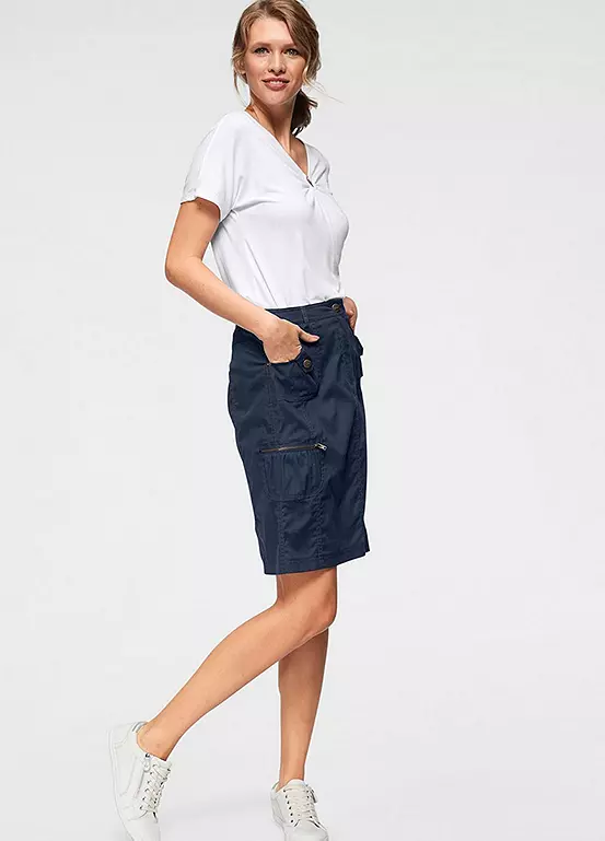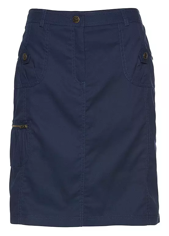 Casual design cargo skirt in a low rise fit. Made from lightweight stretch fabric, featuring large cargo pockets with zipped side pockets, topstitched dividing seams and regular hem.