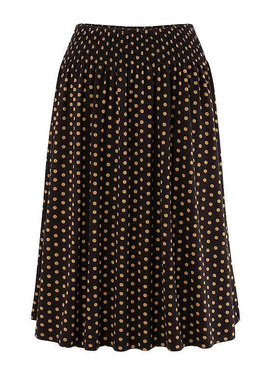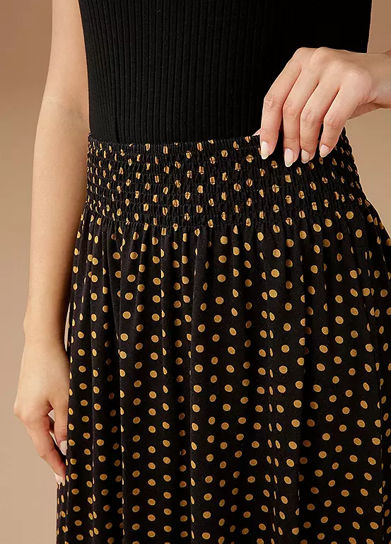 Update your wardrobe with this polka dot skirt with a comfortable smocked waistband. Featuring a figure-flattering slip form and knee-length.