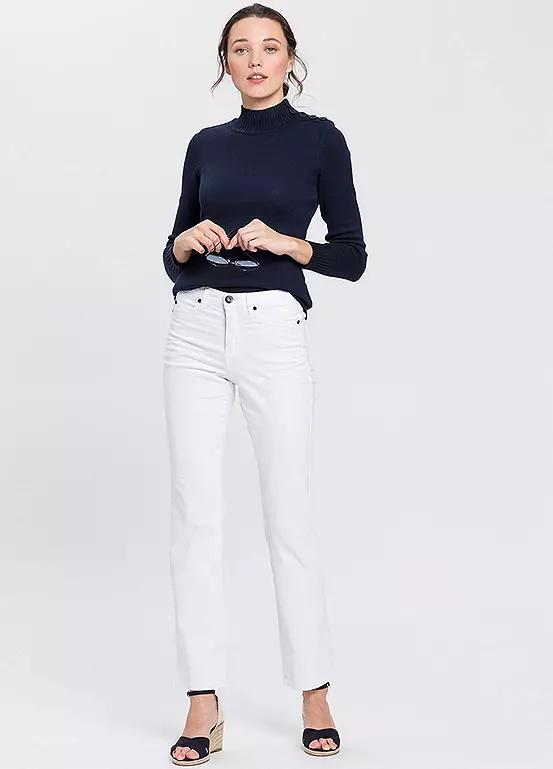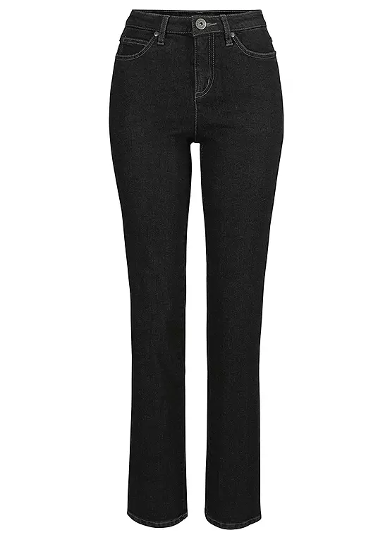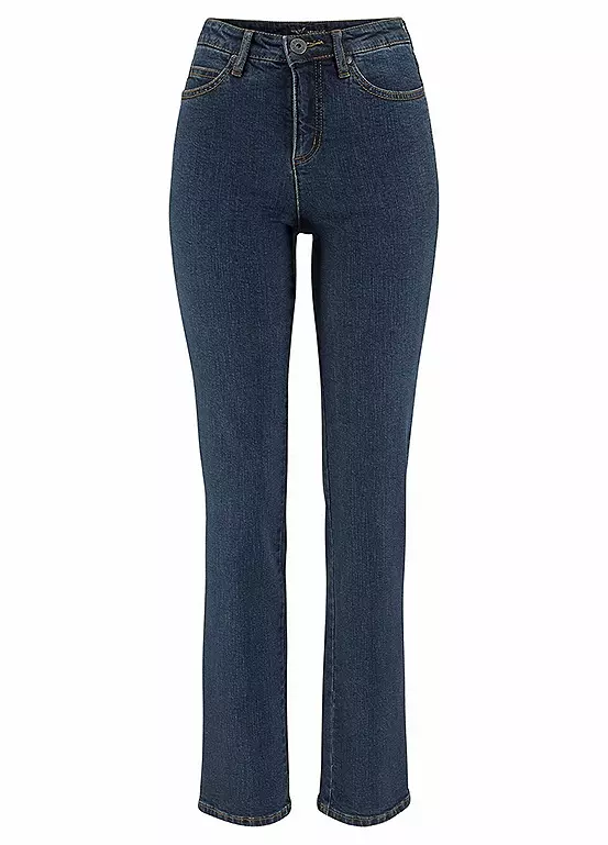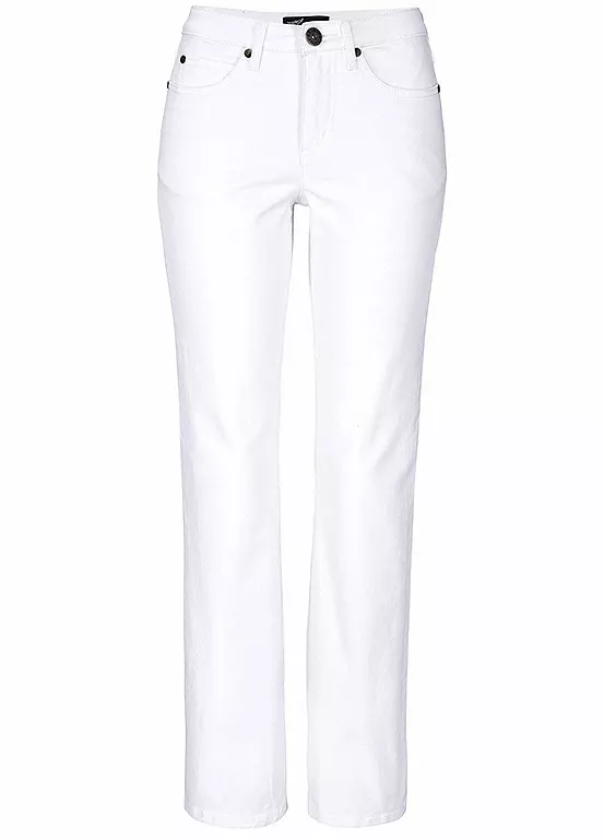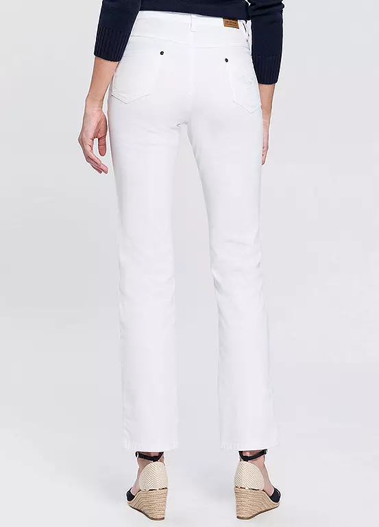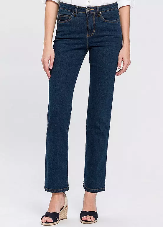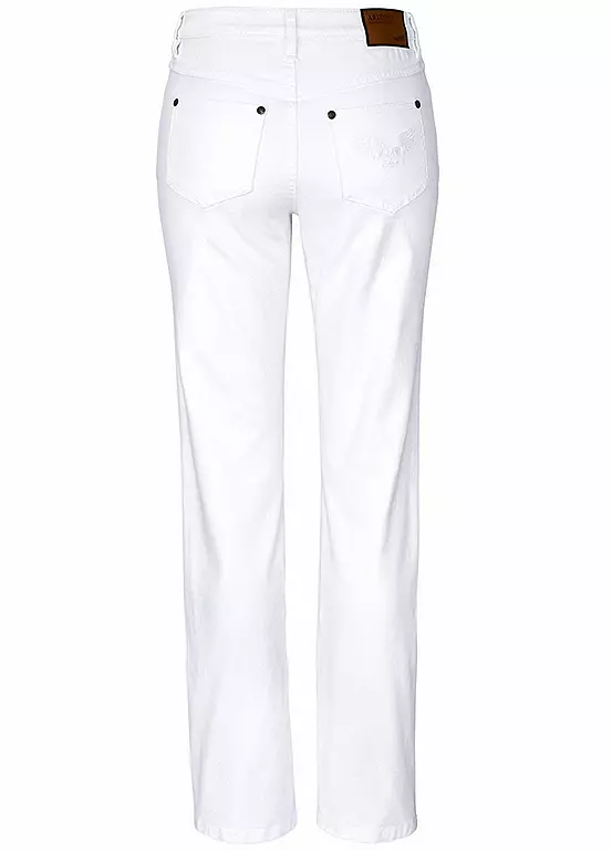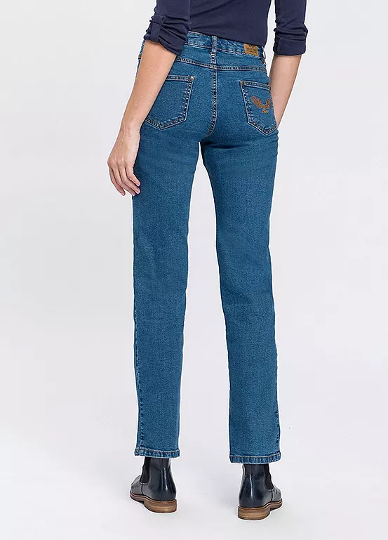 Straight leg in 5-pocket style with contrasting-colour seams and embroidered detail on one back pocket. Soft stretchy fabric in regular sizes