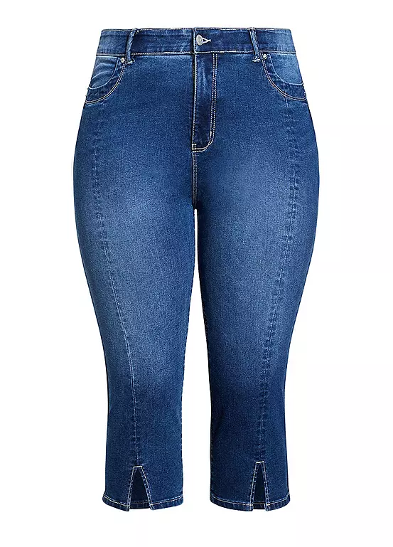 Make the best of impressions in the medium wash Slit Denim Capri. With a cute cropped hemline and centre split front, these mid-rise capris come with an elasticated waistband and single zip fly and button closure style with a skinny leg for the most flattering fit! Wear it with sandals and a pair of sunglasses for the beach!