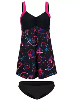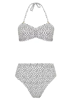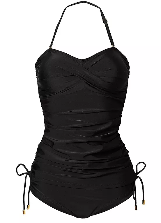 Bandeau style tankini top with ruching detail comes with soft cups and an elasticated underbust with bust lining. Features adjustable and removable straps and adjustable tie sides. Matching bikini bottoms included.