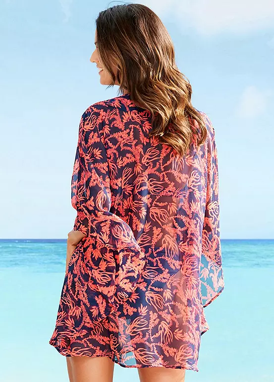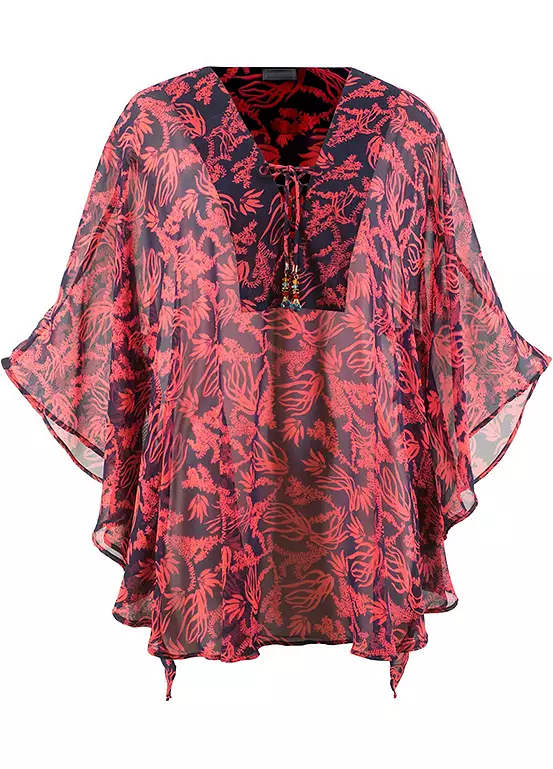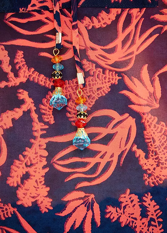 A sheer kaftan that is ideal for the beach or pool. In a wide, boxy cut that has lacing at the neckline that ends with beautiful beading.