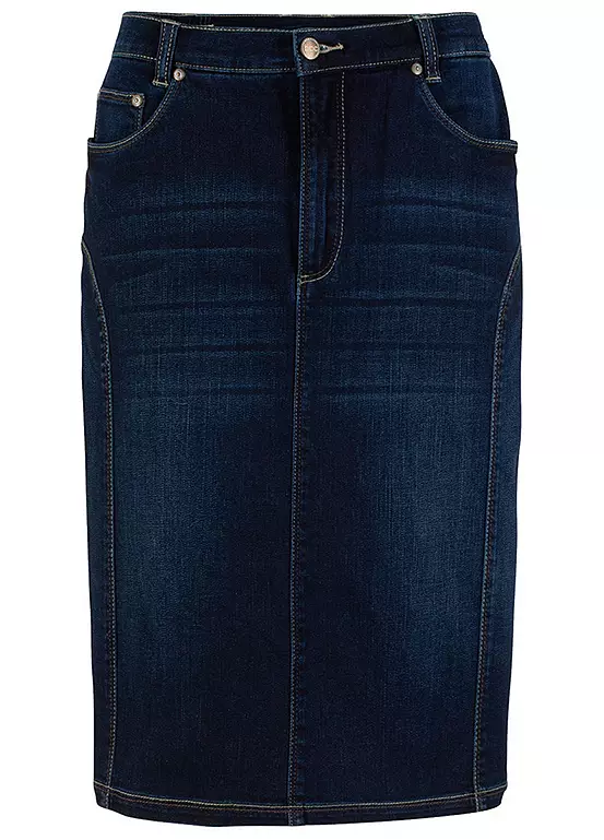 A comfortable straight cut skirt in stretchy denim with flattering seamwork to visually slim your shape.