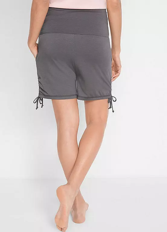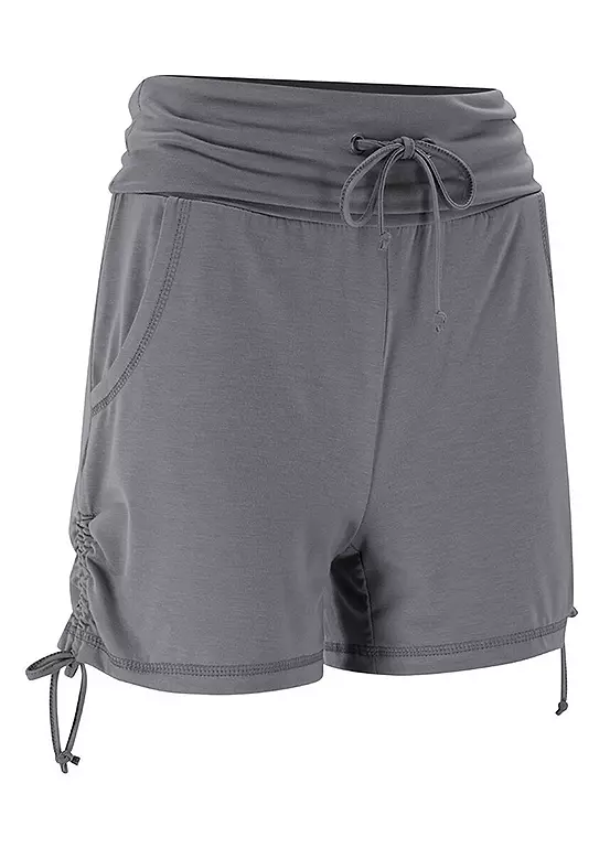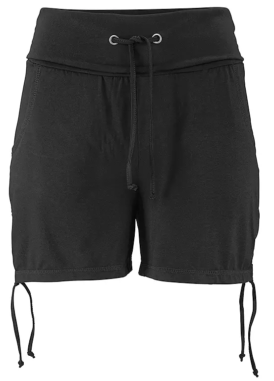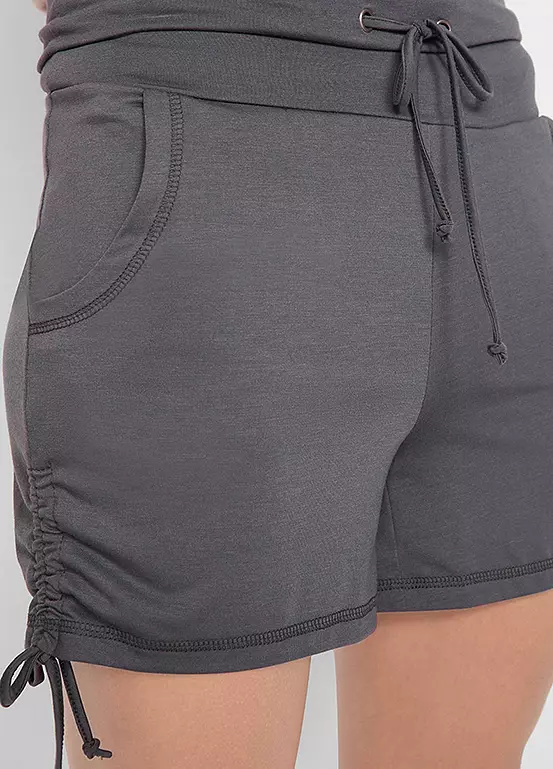 A high rise pair of jersey shorts with a turn-down drawstring waist and two ties at the hems to gather the leg.