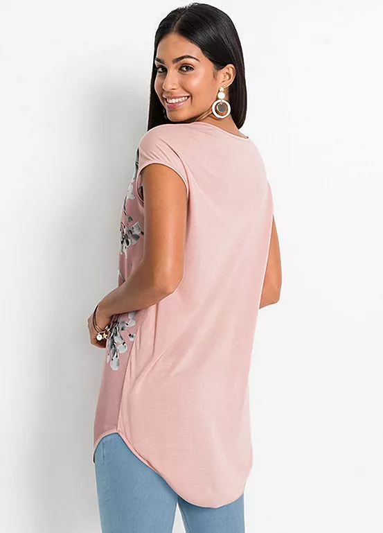 A beautiful short sleeve Summer top, that features a stand-out floral front print, plain back and a longer dipped hem.