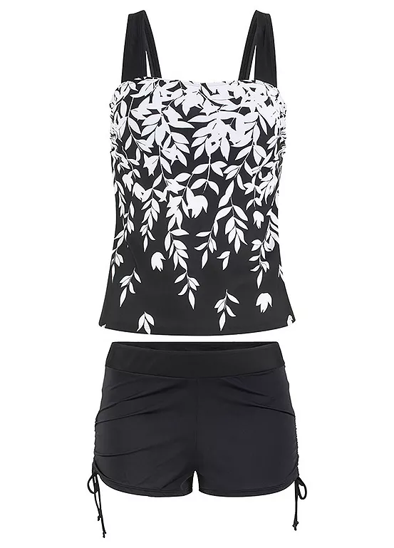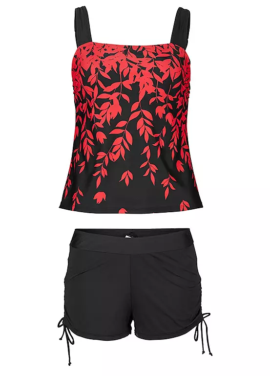 An eye-catching tankini set that is a must for the next holiday. The colour contrasting floral print top has adjustable straps along with padded cups and underbust band, and the plain shorts feature side ties to adjust the fit.