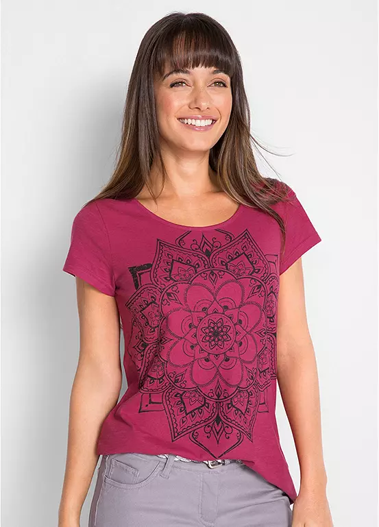 Crew neck slub cotton t-shirt with a large flower design at the front that’s sure to catch the eye.