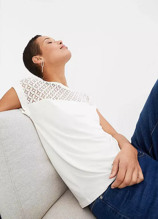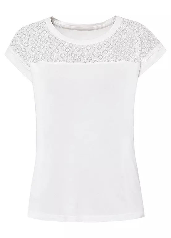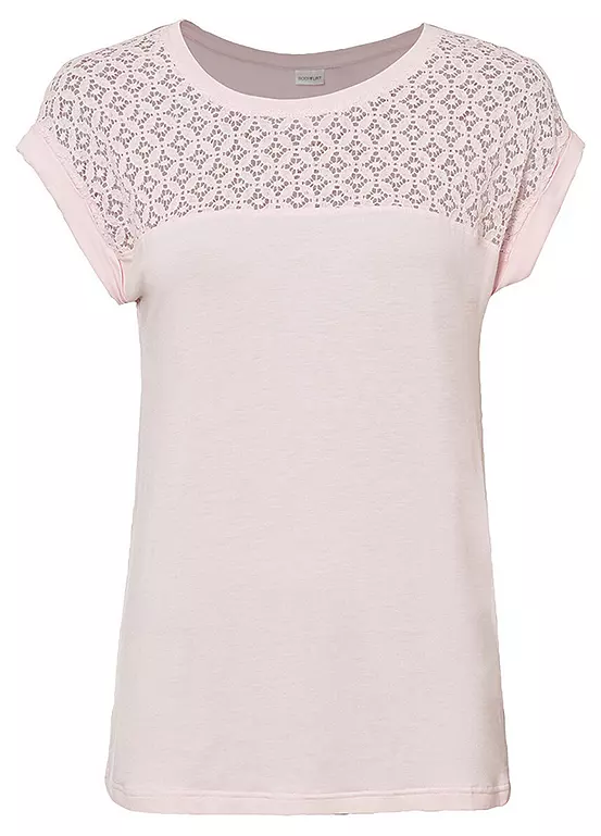 A boxy t-shirt with a sheer lace yoke and capped sleeves.