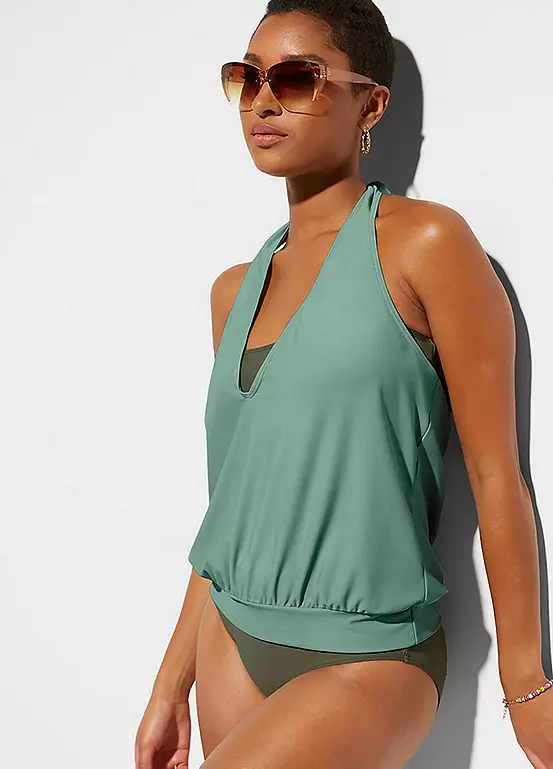 A loose fitting tankini top with a v-neck collar and halter tie straps. The cup padding can be removed and there are matching bottoms included.