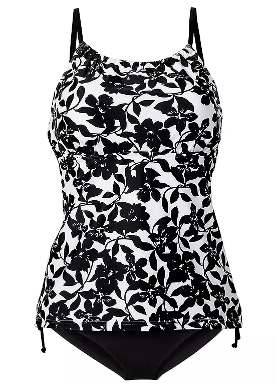 A floral print tankini top with padded cups, an elasticated underbust and adjustable straps. Plain black bottoms with side ties to adjust the width.