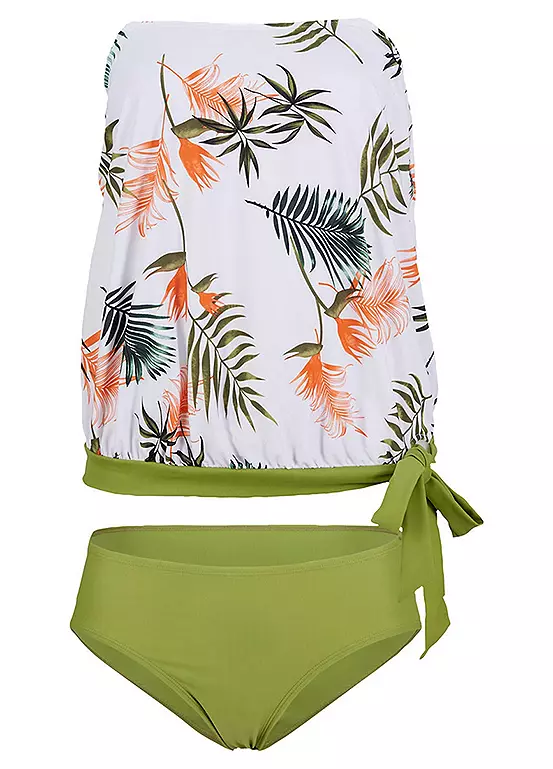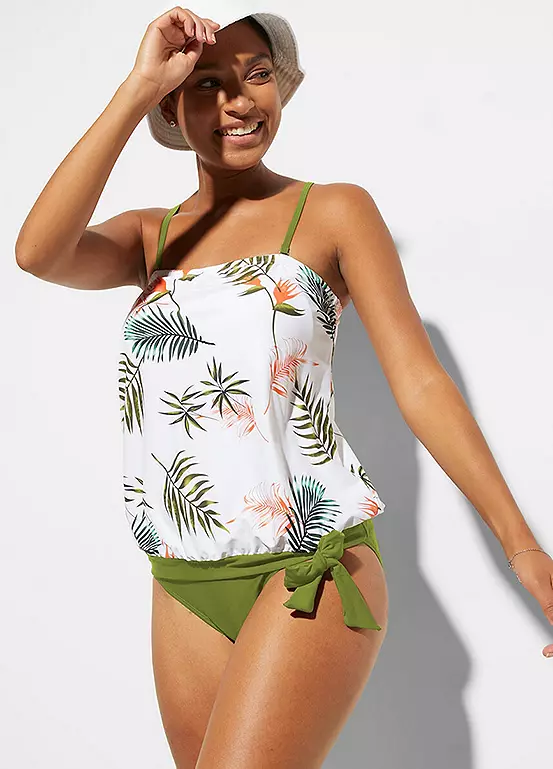 A palm print bandeau tankini top with padded cups and adjustable or detachable straps. The bottoms are plain.