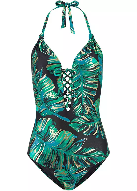 A sexy swimsuit that really causes a stir. In a halterneck design that features a plunging lace-up detail neckline and has a low cut back with a tie closure; plus it has removable cup padding.
