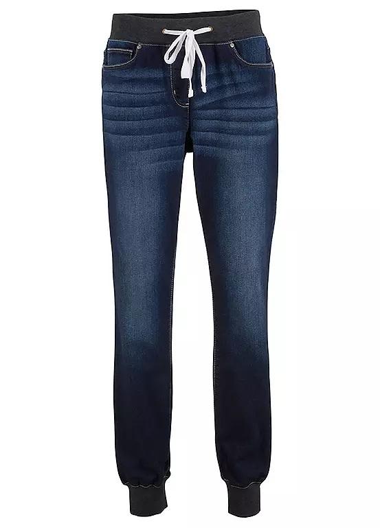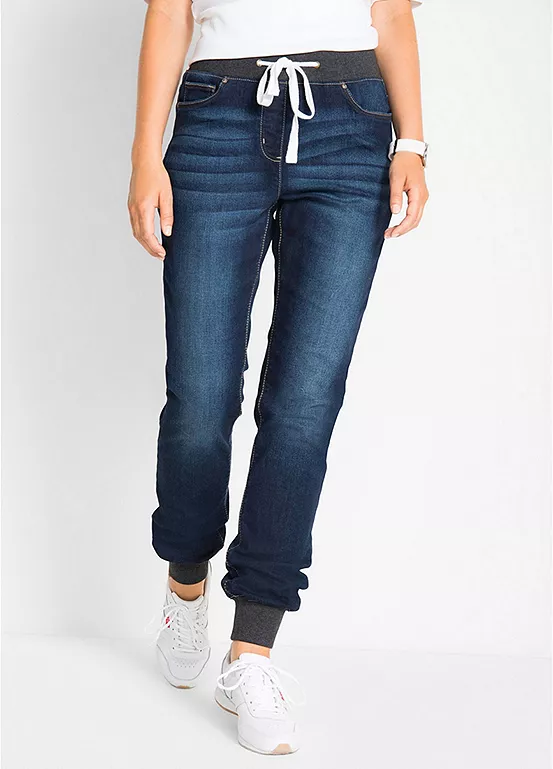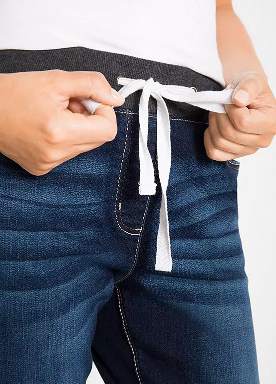 These pull-on comfy jeans come in a boyfriend cut with a stripy jersey waistband.