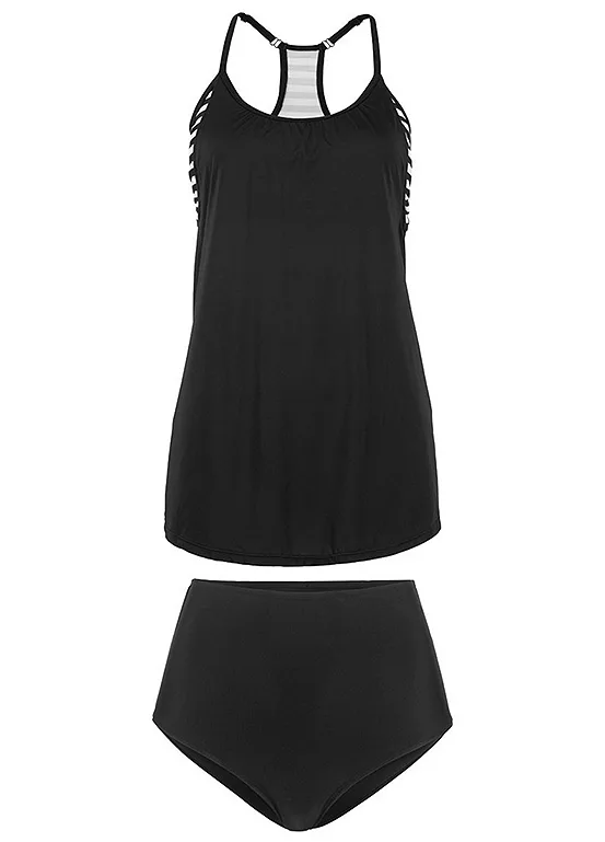 An unusually designed tankini set that makes a trend-conscious impression. This cool layered look top features a printed bustier with a sewn-on oversized top, along with adjustable straps and removable cups and is in a racer back. The matching printed bottoms are lined.