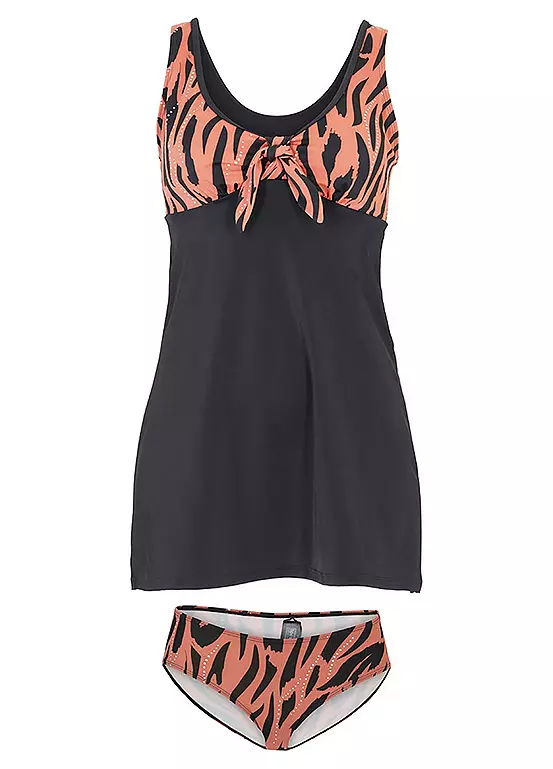 Leopard print scoop neck tankini top in a longer cut and matching bottoms.