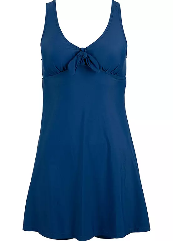 Simple in design, yet a great looking A-line swim dress. With padded cups and a tie at the bridge.