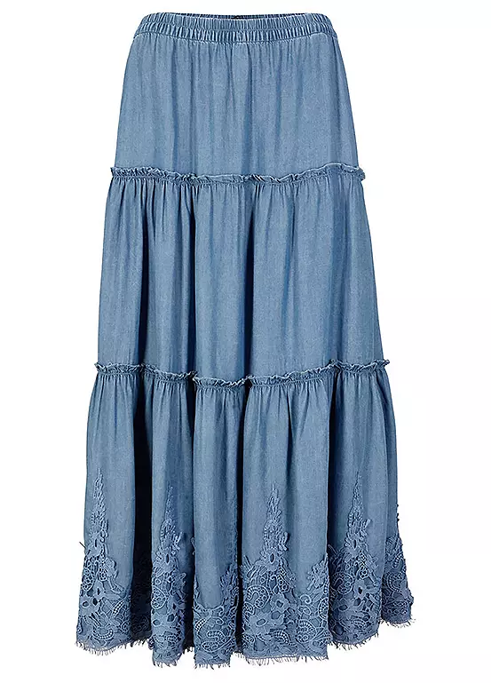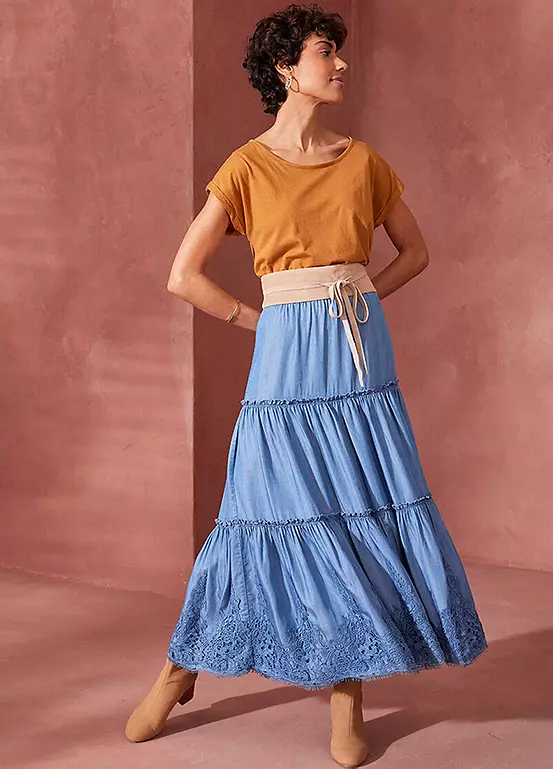 Tiered tencel skirt with lace trim.