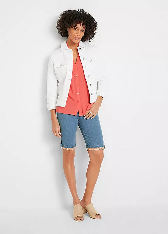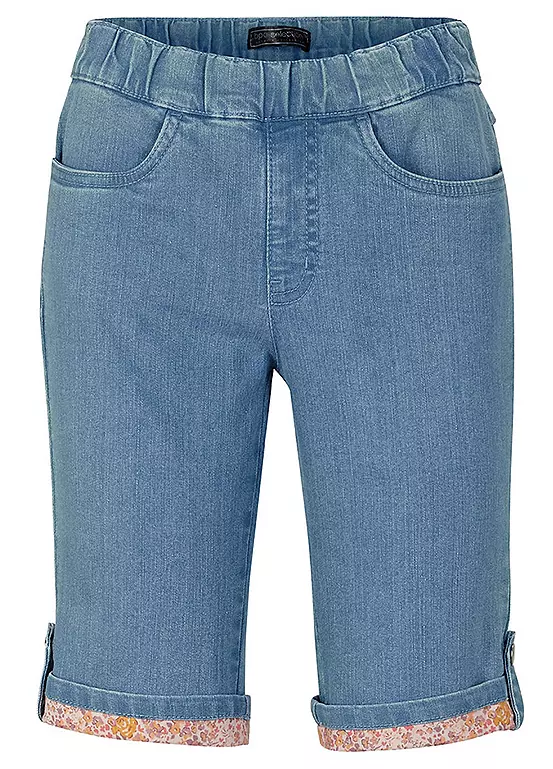 Versatile denim shorts with a high elasticated waistband, which is wonderfully comfortable, and also gives the appearance of a flatter stomach. Finished with belt loops, mock zip panel and 2 front pockets. Pull on shorts with printed turn-ups.