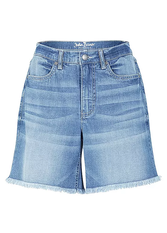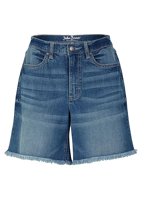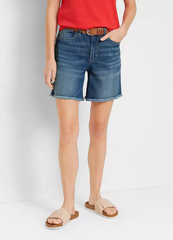 High-rise denim shorts with raw hems.