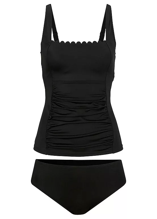 A ruched tankini top with a wavy neckline and matching bottoms.