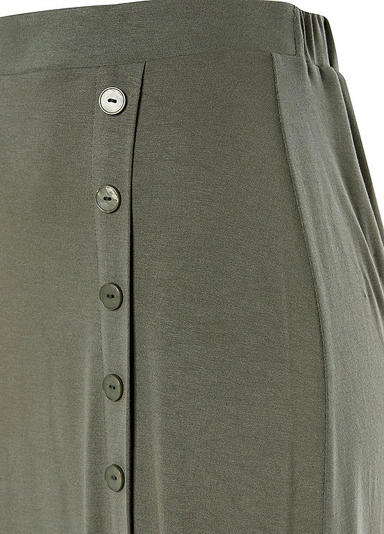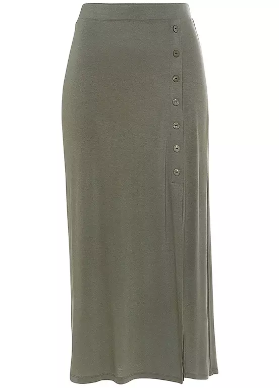 Timeless midi skirt with a waist-high waistband and decorative buttons on the side. In soft flowing viscose jersey fabric, this piece goes well with crop tops.