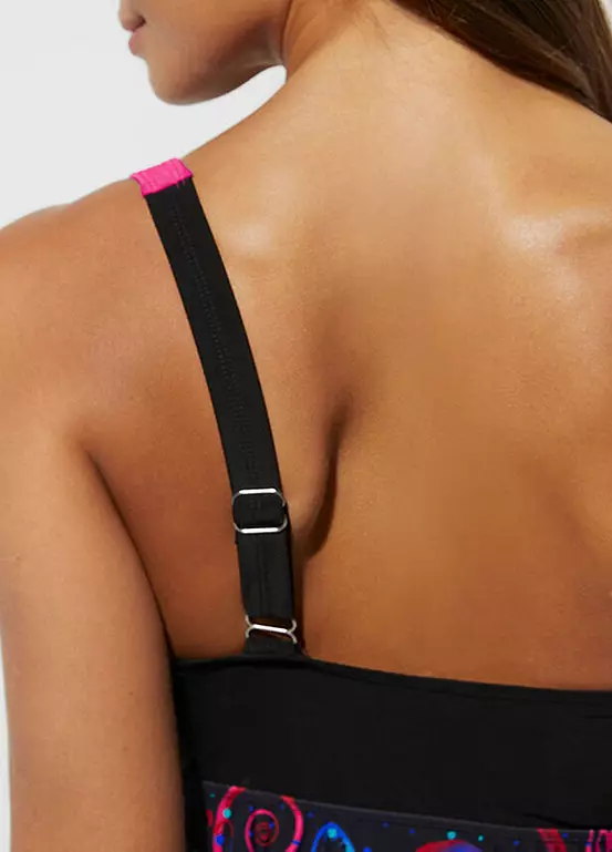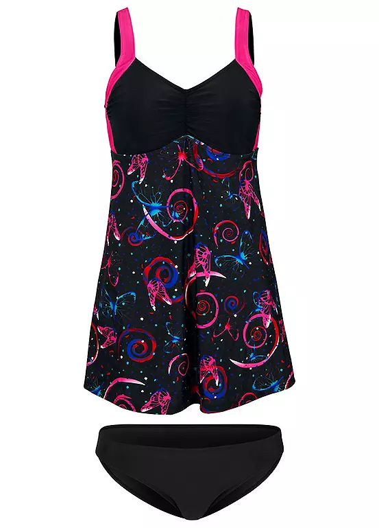An extra long tankini top with adjustable straps and a butterfly pattern. The bottoms are plain.