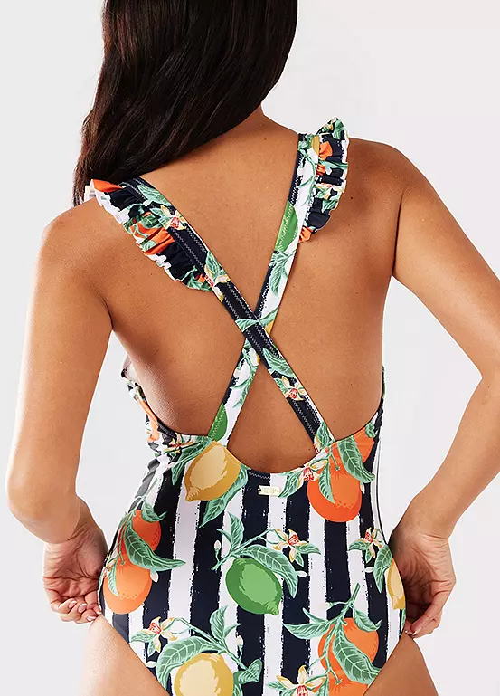 This swimsuit boasting a background of bold navy with white stripes and illustrated lemons, limes and oranges is a vibrant swimwear necessity for your upcoming holiday. With a stylish clash of colours and shapes, this swimsuit features a deep V-Neck, decorative frill detailing on the straps and removable padded cups.