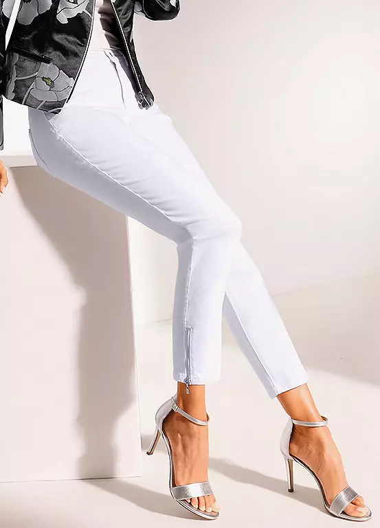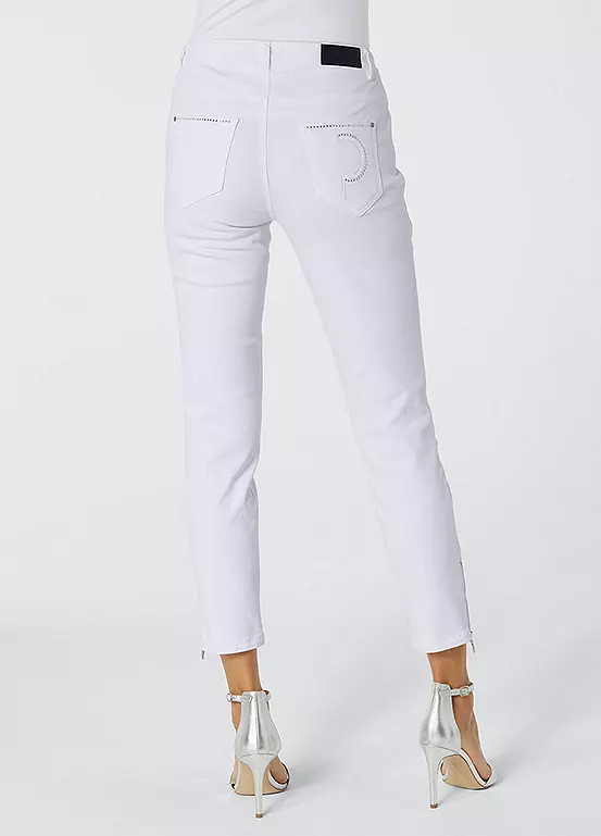 High-quality jeans in a 5-pocket style featuring decorative rhinestones and intricate embroidery on the back pockets, shimmering studs on the front pockets and silver coloured zips on the leg hems. In a cropped length, they fit comfortably thanks to the stretch fabric.
