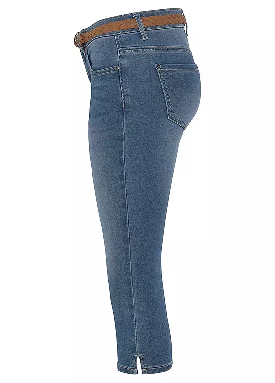 Capri length jeans by DELMAO in a slim cut with a logo embroidery. In a regular rise, they feature small slits at the leg hems for a comfortable fit. A fashionable braided belt is included.