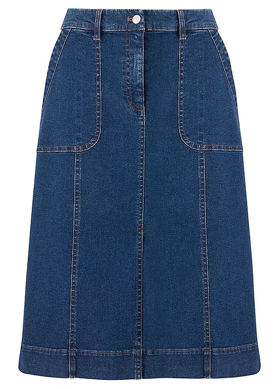 Stretch denim midi skirt with front split and button front. Giving your jeans the day off just got easier.
