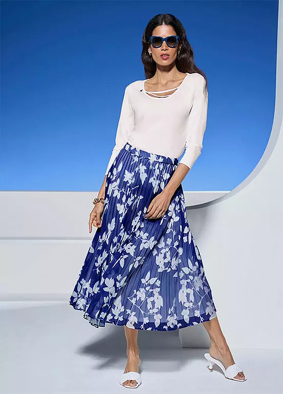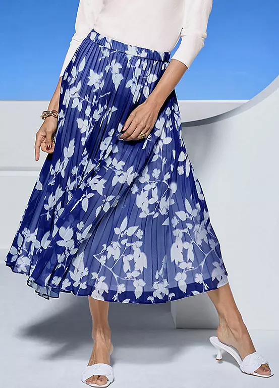 A stylish pleated skirt with an artistic leaf print, slightly transparent chiffon fabric and a flowing A-line shape. Finished with a comfy, fully elasticated waistband.