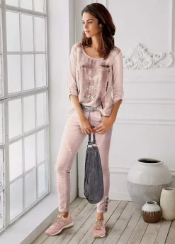 5-pocket style jeans with a straight leg. Featuring lace and embroidery at the top and small rhinestones on the leg hem. The jeans provide a comfortable fit thanks to soft stretch fabric.