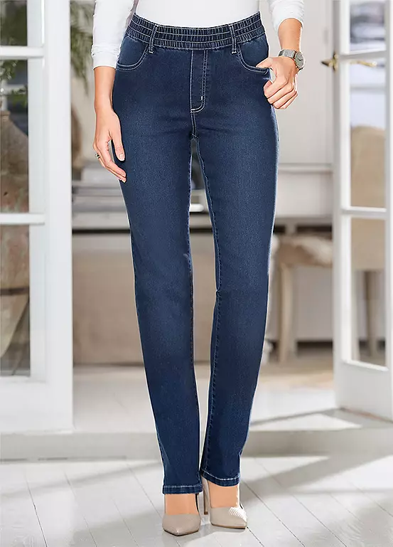 The extra-high fully elasticated waistband is the highlight on these jeans. It not only looks super trendy, but also makes your tummy appear flatter! With belt loops, a mock zip, two front pockets and two back pockets.