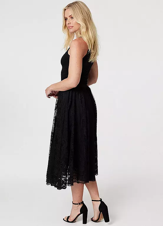 Add a chic feminine style to your wardrobe with this pretty lace skirt. It has a high waist and a soft, floaty midi length hem. Pair with neutral strappy heels and a tucked in fitted top or blouse for a sophisticated on-trend look.
