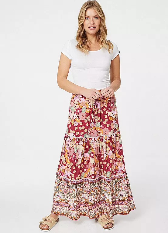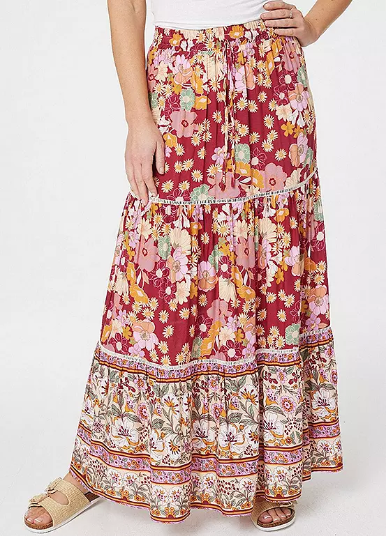 Add a comfortable yet stylish full length skirt to your holiday wardrobe with this floral tiered maxi. Made from 100% viscose, it has a self tie elasticated waist and a tiered ankle length hem with a crochet trim detail. Pair with a neutral t-shirt and sandals for a feminine warm weather style.