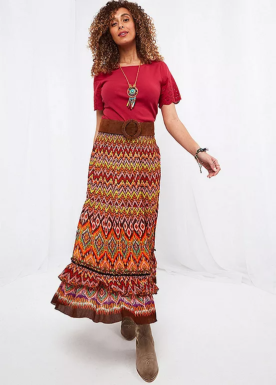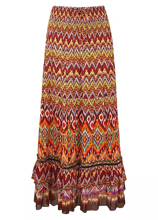 You’ll bring full-on festival vibes wearing this gorgeous maxi skirt. Bringing together a zig-zag print with soft, earthy colours and a playful tassel tie, it perfectly hits that beautiful boho look. Just add your favourite boots and wide-brim hat to really stand out from the crowd.