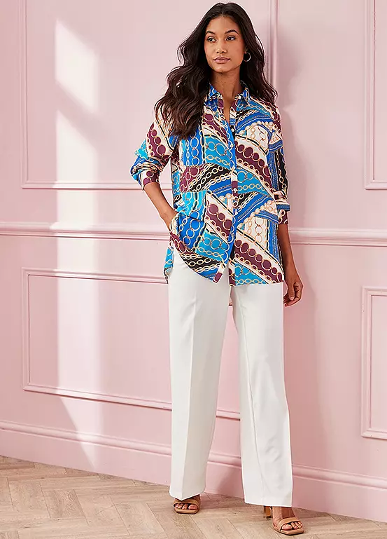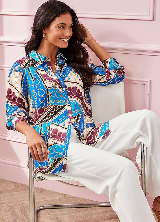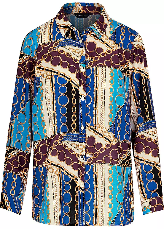 Longline chain print shirt with feature gold button fastening. A staple for any wardrobe and the print elevates any look to the next level.