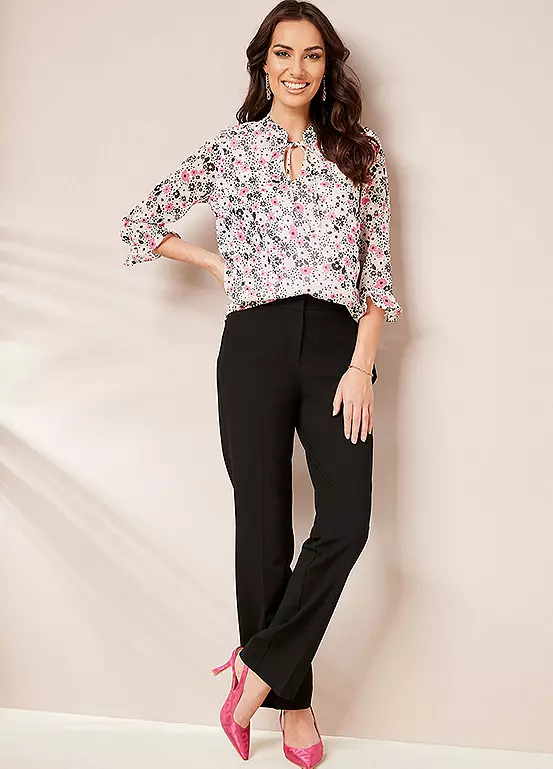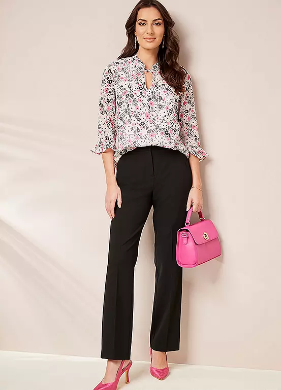 Our best seller is back! Feminine floral tie neck blouse with stylish flute cuff. Pair with jeans for a smart casual look.