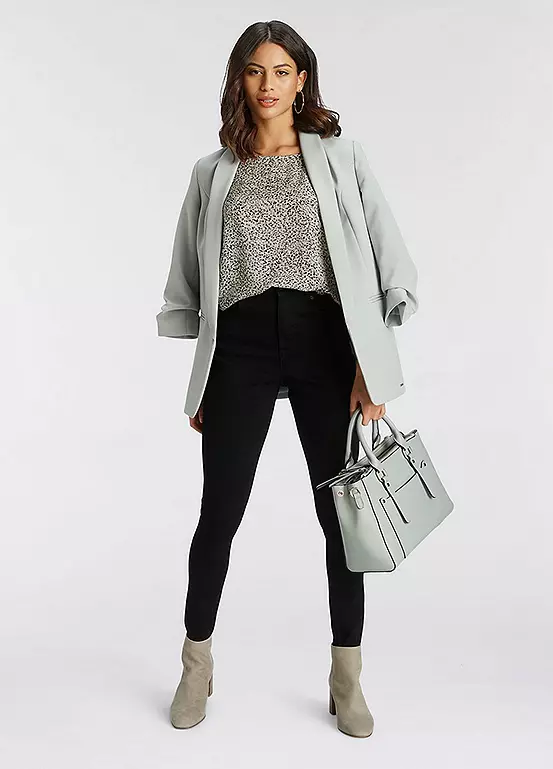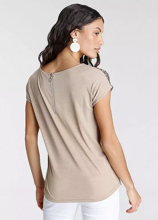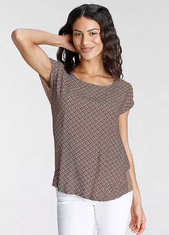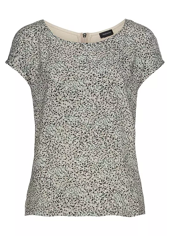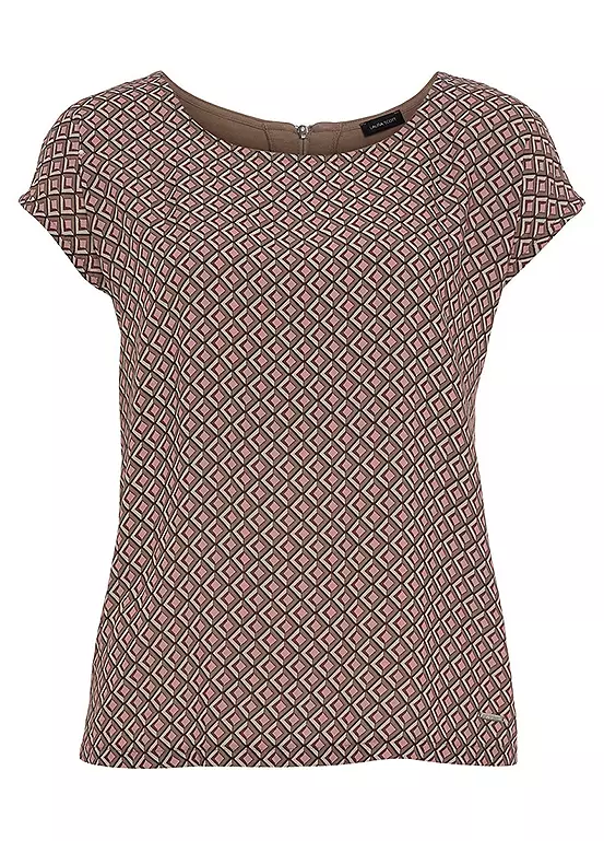 Feminine blouse in a casual cut with short sleeves and a rounded neckline. With all-over print blouse at the front and single-coloured jersey back. Complete with a discreet decorative zipper on the back.