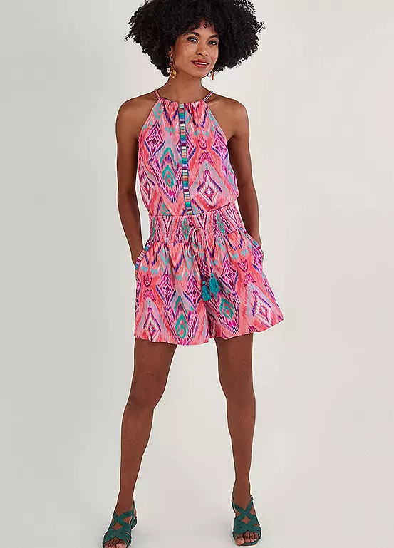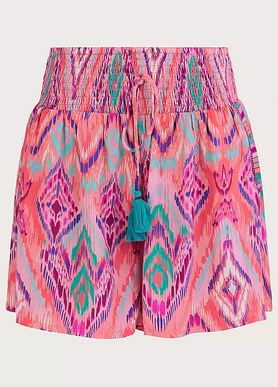 Get in the spirit of summer when you slip into these shorts on your first morning under the holiday sun. Designed in airy LENZING™ ECOVERO™ viscose, it features a bold ikat print whilst accented with taping to the side pockets. They have the most comfortable silhouette, with a stretchy shirred waist and loose shorts, finished with a tie detail.