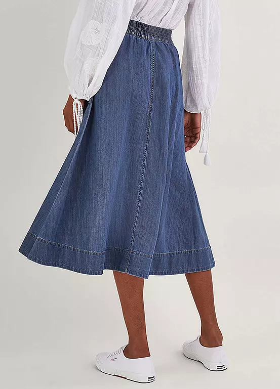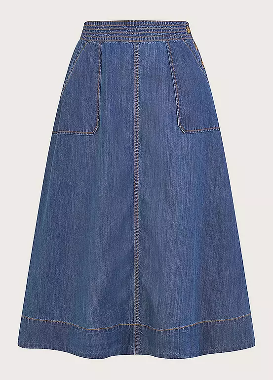 Spun to feel lightweight, her light denim wash and midi length will see you through the springtime and into breezy beer gardens in autumn. The shirred-look waist and A-line skirt shapes your silhouette beautifully, simply tuck in a floral blouse and you’re good to go.