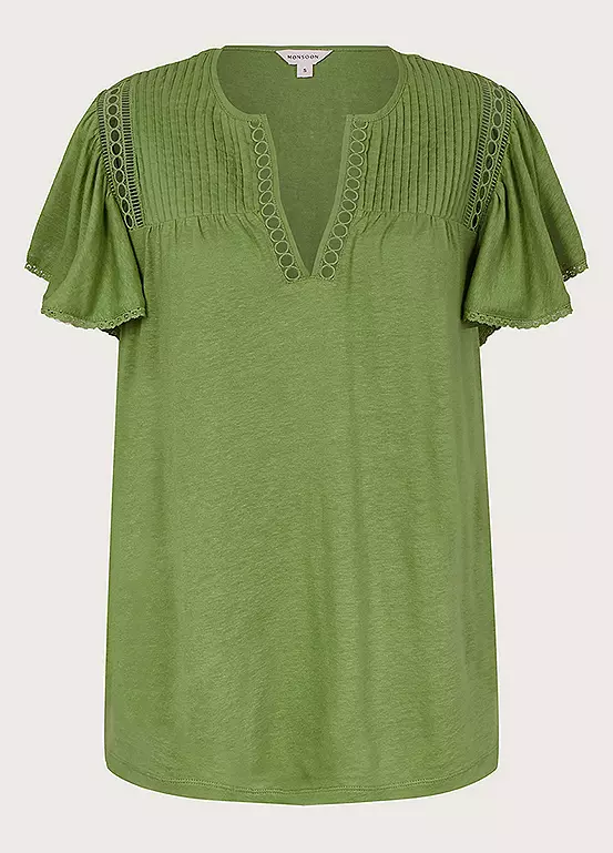 Pretty details ranging from lace trims to accent cutwork makes this top a strong contender for your every day outfit pairings. Falling into a loose and airy fit with complementing flutter sleeves, the V-neck provides the perfect space for a single pendant necklace to hang.