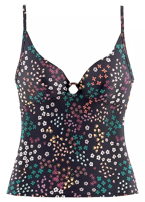 This tankini top has an adorable floral print with a golden decorative ring in the middle of the two cups. The tight cut and removable cups accentuate your figure without showing too much. Thanks to the pleasant microfibre, the top is super comfortable and sits nicely on the skin. Can be combined with various bottoms.