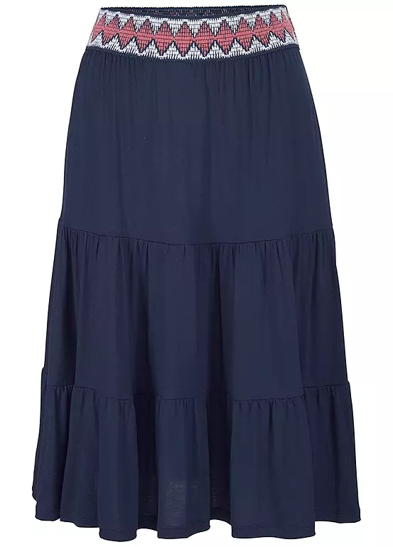 Simple and stylish flounce skirt that features an on-trend wide, ikat embroidered elasticated waistband.