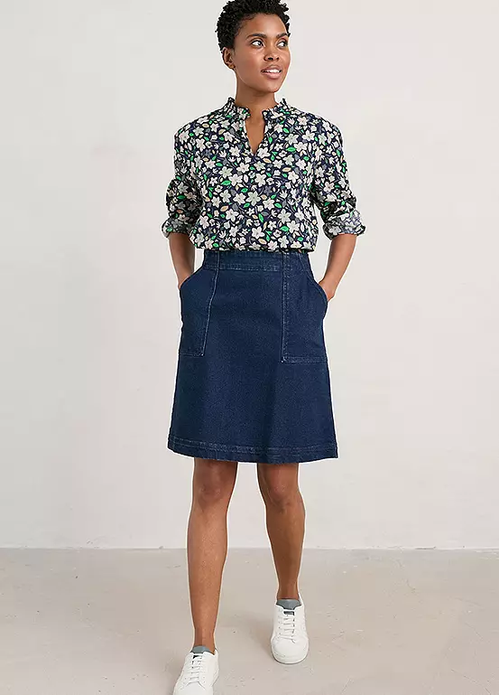 An A-line cord skirt that finishes just above the knee. It has an invisible side zip and elasticated back waist for a comfortable fit. Finished with handy pockets, we love it paired with tights and boots.