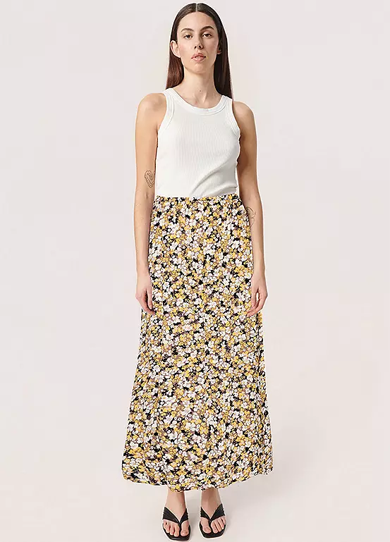 The Zaya skirt is a flowy maxi skirt with a bohemian vibe. It is a full-length A-line skirt with a soft and flowy silhouette. It has an elasticated waistband that makes it comfortable to wear all through the day. The skirt is made in a beautiful print, and you can style with a basic top or t-shirt for an effortless and carefree look.