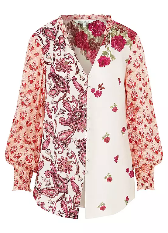 This gorgeous mix floral and paisley print blouse features button through front fastening frill detail to the collar and blouson style sleeves. Looks great teamed with bootcut jeans.