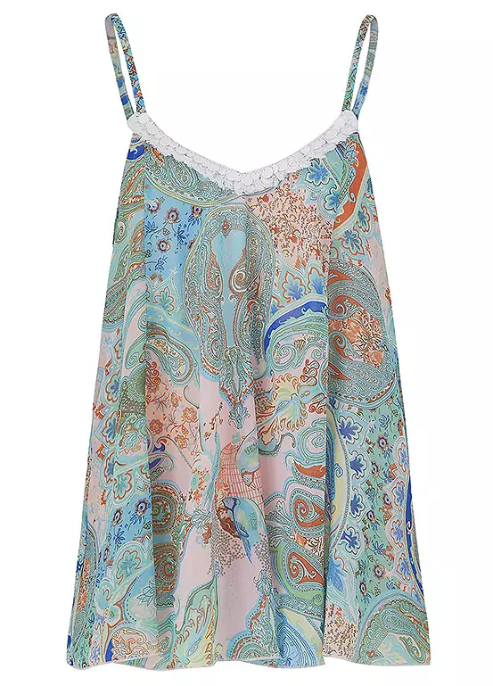 This cami top comes in a paisley print and is in a classic swing shape. It has a V-neckline with fringe and shell effect disc detail.