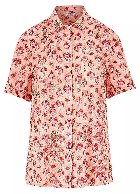 Our sequin detail relaxed shirt in a stamp print, is perfect to step into Spring. Featuring capped sleeves, button front fastening and looks great worn with embellished jeans and wedges.